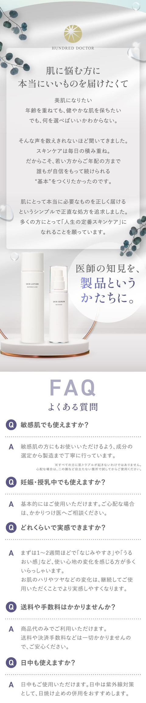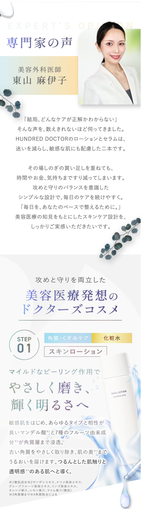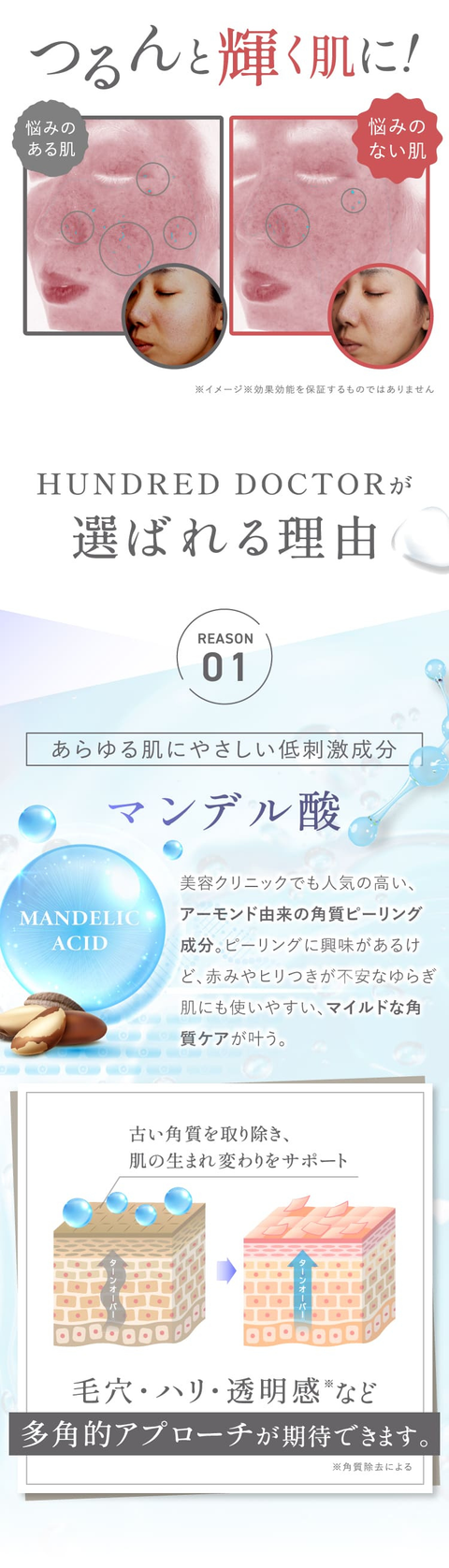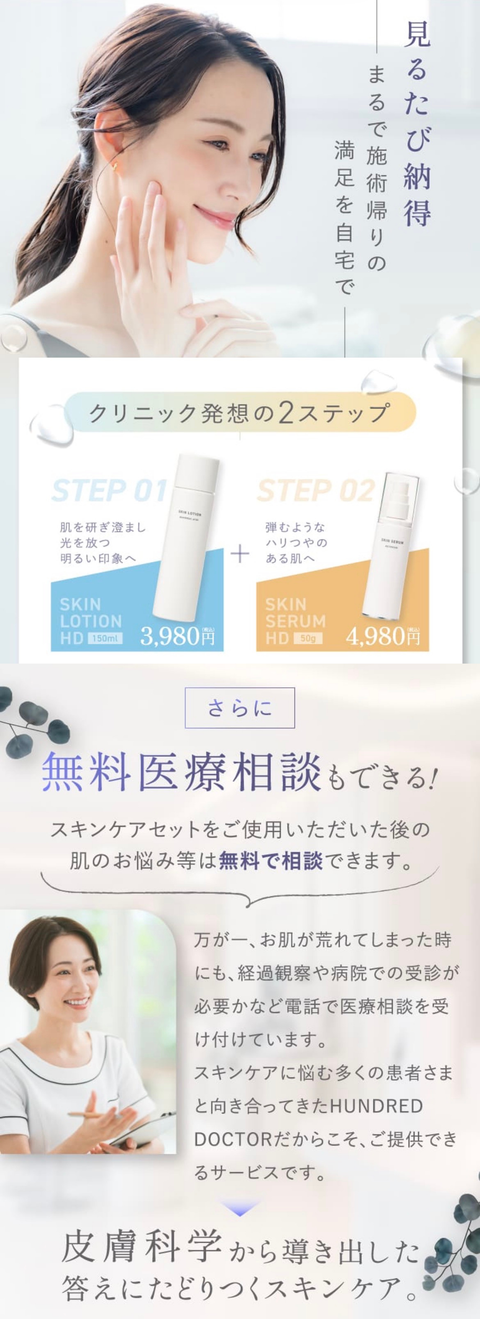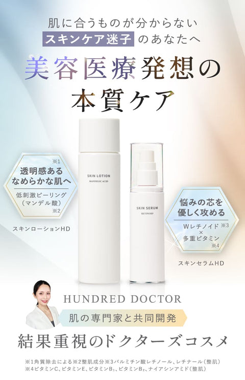 ・使用中や使用後に赤み・はれ・かゆみ・刺激・色抜け(白斑等)や黒ずみ等の異常があらわれた時は使用を中止し、発売元であるHUNDRED DOCTOR(株)にご相談ください。